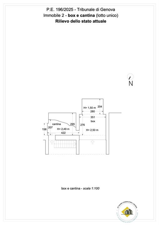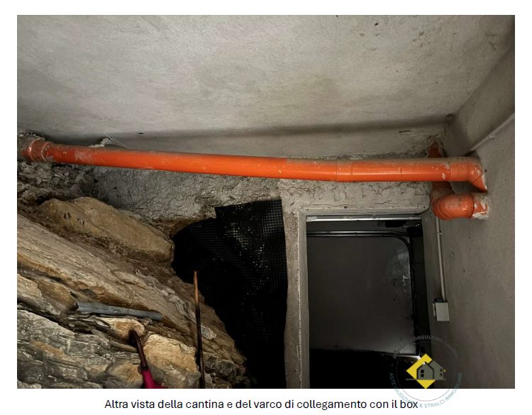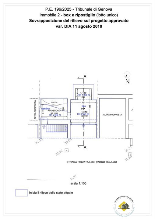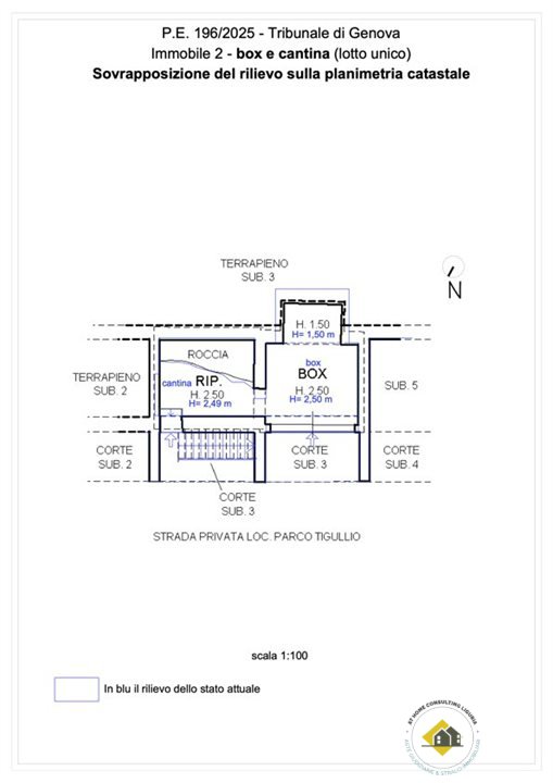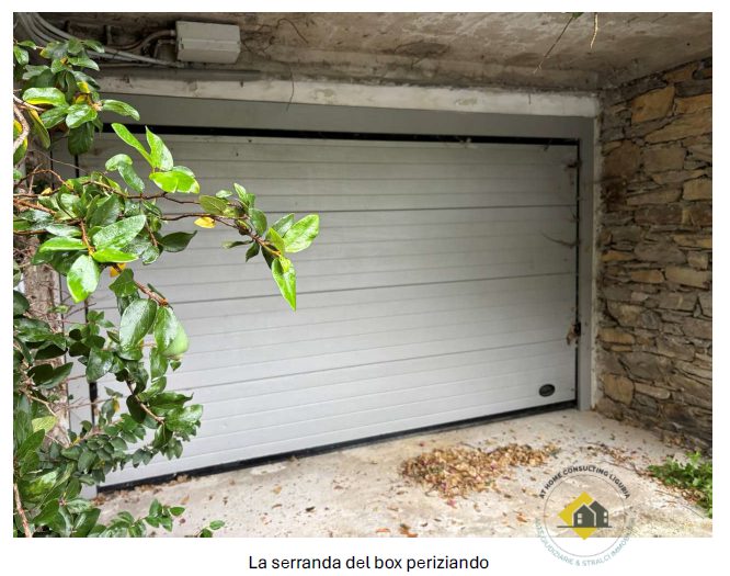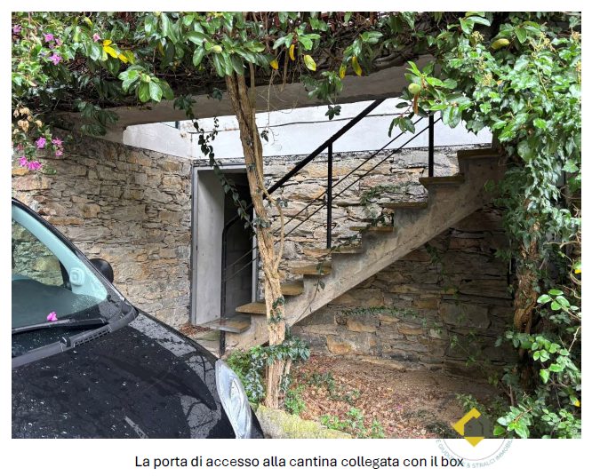 Box interrato, ricavato nel sedime del fabbricato originario, sbancando il terrapieno a livello strada. L'accesso è direttamente dalla strada privata del Parco Tigullio. Le dimensioni sono utili per il parcheggio di un auto del segmento medio essendo la sua lunghezza interna utile di circa m 4,60. La larghezza dell'accesso è di m 3,50, la larghezza interna è di m 3,50 per circa metà della sua lunghezza, mentre la parte più interna ha larghezza di m 2.20. L'altezza interna è di m 2,50. A lato del box vi è un locale di servizio ad uso cantina, di larghezza analoga al box e di profondità variabile tra m 2,90 e m 2,10, a seconda della configurazione della roccia che è rimasta a vista nel vano.