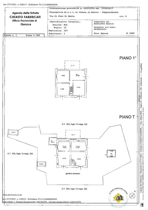 Piena ed intera proprietà dell'appartamento in Genova, Via Pino di Murta 9, posto ai piani primo e terra, con terreno di pertinenza. Al piano terra si trovano ingresso, soggiorno, cucina, cantina e ripostiglio mentre, al piano primo, si trovano tre camere da letto ed un servizio igienico. Risultano far parte dell''unità due lavatoi e un capanno insistenti sul terreno di pertinenza.